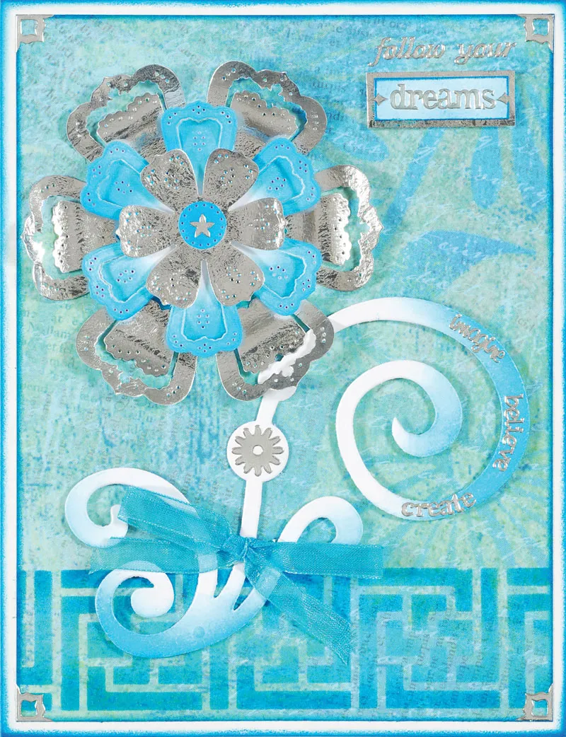 Ink a 1 1/8”x3/8” white, mat on silver with a 1/16” border, place “dreams” Dazzles™ on it and foam tape to card. Place “follow your” Dazzles™ and other Dazzles™ as shown.