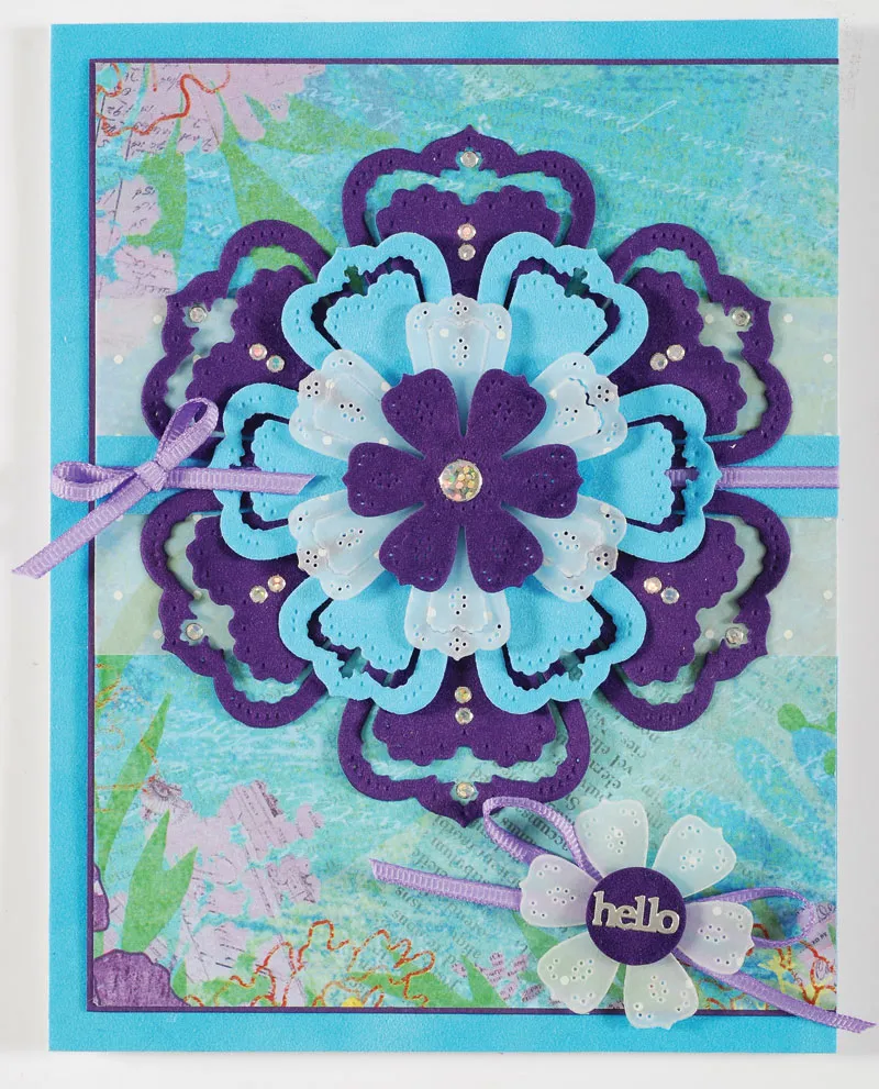 Layer the 4 1/2" violet flower, the 3 1/4" powder blue flower, the 2 1/4" vellum flower, and the 1 1/2" violet suede flower together with foam tape, from largest to smallest. Glue centered over the vellum rectangle. Decorate the violet suede flowers with Silver Jewel Dazzles™.