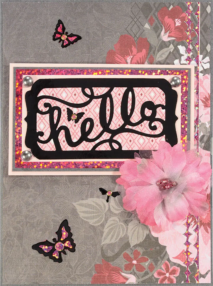 Place the “hello” frame Dazzles™ on Ruby Rose pink diamonds paper and trim along the edges. Mat it on pink cardstock with 1/16" borders, then on pink Sparkle sheet with 1/8" borders. Discard the backing from the Sparkle sheet and mat it on gray cardstock, then on pink cardstock, both with 1/16" borders. Foam tape the greeting to the front, 1 3/8" from the top.