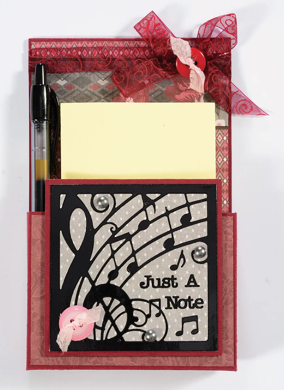 Place the “just a note” frame Dazzles™ on Ruby Rose gray diamonds paper and cut along the edges. Place the message and music notes Dazzles™ in the frame as shown. Mat the frame on maroon cardstock with 1/8" borders, then foam tape it to the front, ¼" from the bottom.
