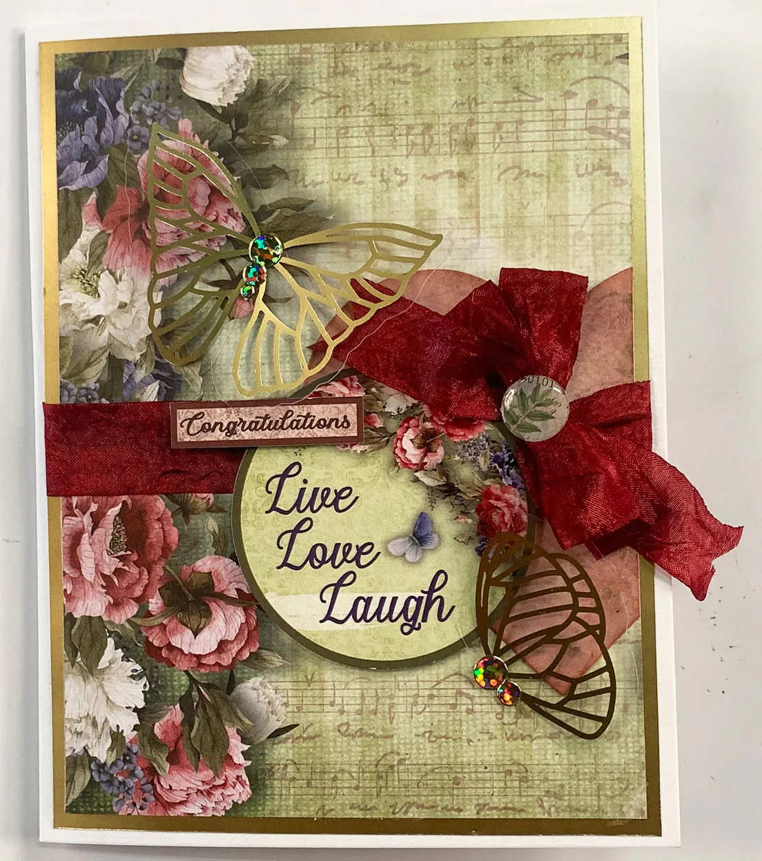 2. Wrap a 6" length of burgundy crepe ribbon across the center of the cardstock, gluing the ends to the back. Glue the cardstock centered on the card front. Foam tape the Romantic Florals “live, love, laugh” die-cut to the front overlapping the ribbon as shown. Tie a 4-loop bow with the same ribbon, tie the center with thread, then glue it to the first ribbon as shown.