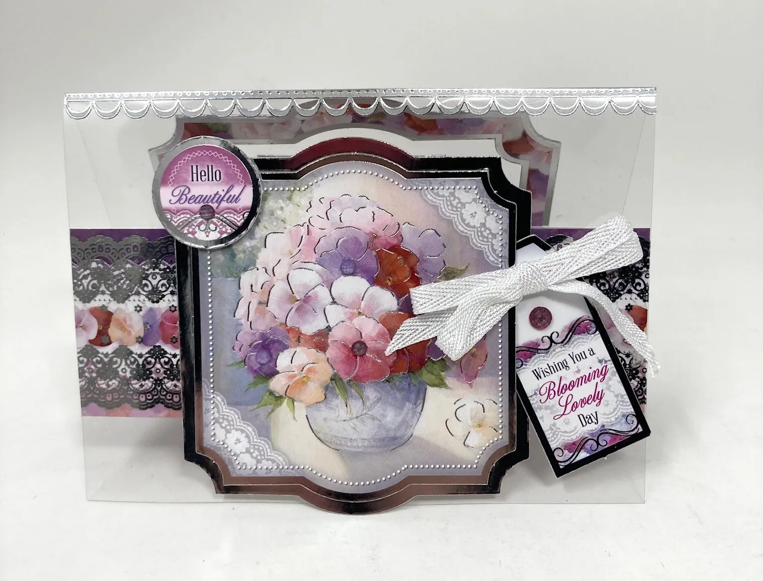 Select the large square image from the Topper sheet. Glue the silver frame to card front just over the lace area. Foam tape the center image inside the silver frame. Glue "Blooming Lovely" tag as shown. Make and Zot a 2 1/2" wide bow on the right. Foam tape "Hello Beautiful" sentiment and place Diamond Sparkles as shown. Position Border Dazzles™️ across the top.