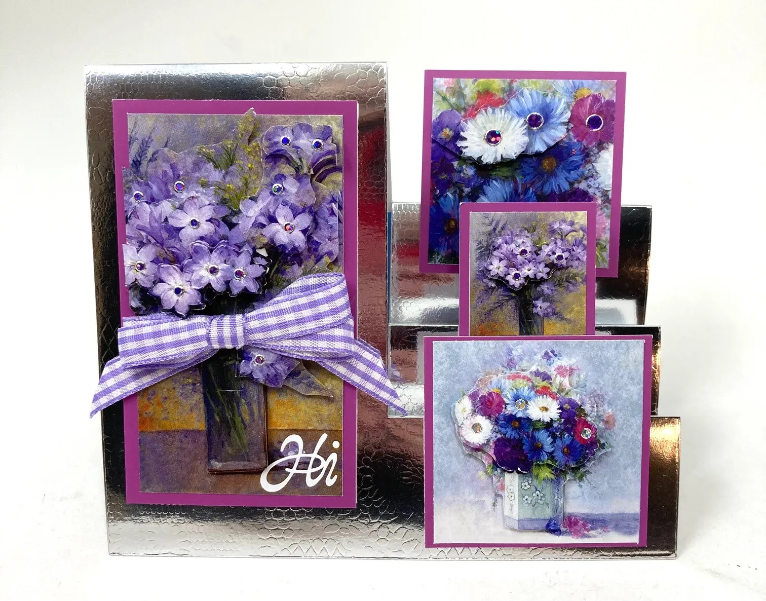 Card Front- For the left step cut a purple flower vase to 2”x3¾”. Mat magenta Adorable Scorable with 1/8” borders. Foam tape on the left as shown. Cut out many flowers from identical tiles and foam tape them in layers for dimension. Place small purple Jewel Dazzles™️ stickers on the centers. Make a purple bow 2 1/2" wide bow and Zot™️ as shown. Place the "Hi" Dazzles™️ at the bottom.