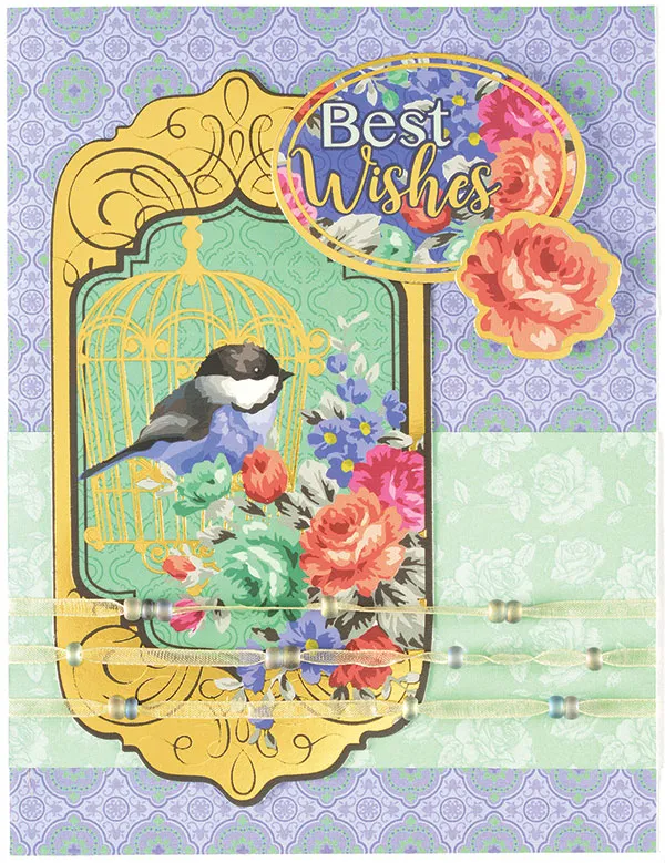 Punch out the three Gorgeously Gilded die-cuts shown and remove the nibs. Glue the cage label near the left edge, sliding it under the ribbons. Foam tape the greeting and rose die-cuts at the upper right as shown.