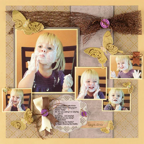 Mat the small photos on ivory cardstock with 1/16" borders. Notch one end of a 2" rust ribbon, then wrap and glue it over small photo at the upper right. Glue and foam tape all the small photos across the page as shown. Tie a small brown jute shoestring bow and glue to the rust ribbon loop.