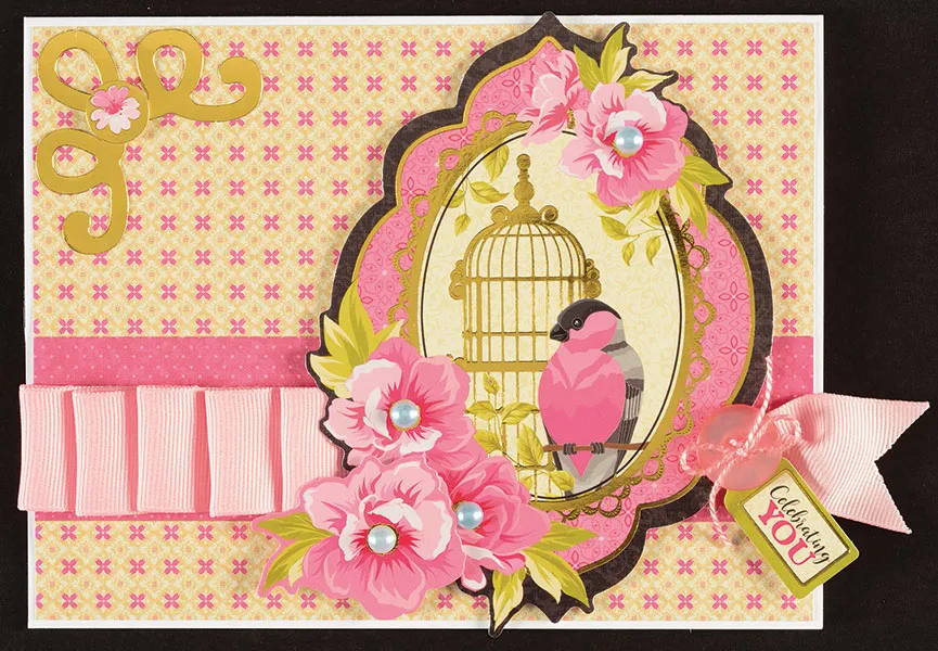 Punch out the bird cage label and “celebrating you” die-cuts and remove the nibs. Foam tape the label near the right edge as shown. Thread a ¾" button, then glue it over the ribbon and label edge on the right. Foam tape the tag extending from under the button, then tie a thread shoestring bow and glue to the button.