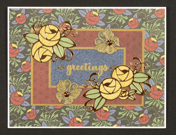 Cut 3"x1½" The Charleston blue paper and stamp “greetings” in the center. Cover it with embossing powder, tap off the excess, and heat the remaining powder to melt it. Mat the paper on Gold paper with 1/16" borders, then glue it centered on the maroon rectangle.