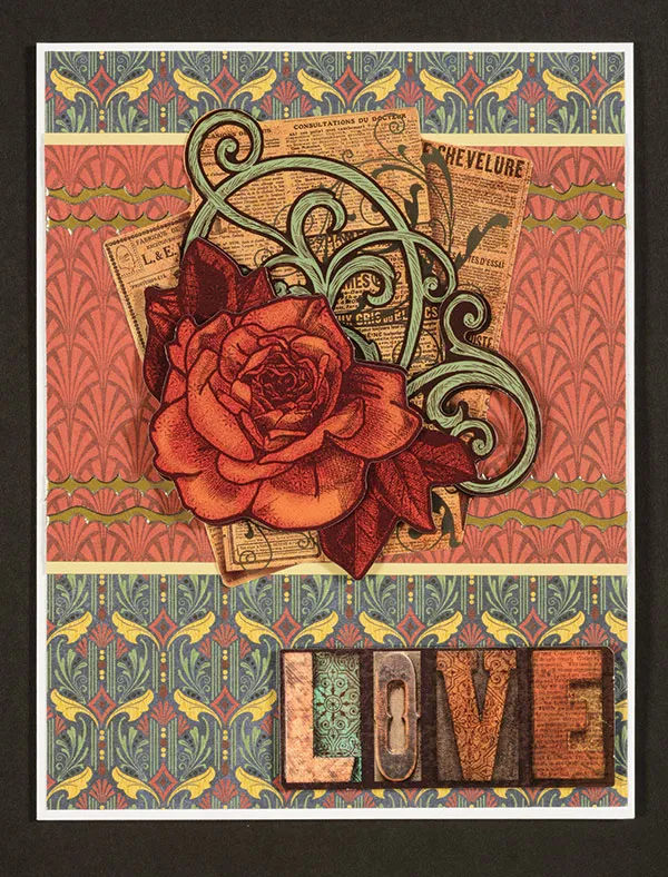 Assemble the roses paper tole design with foam tape between the layers, then glue it centered on the red fans paper. Foam tape piece #3 of the “love” paper tole design in the lower right corner.