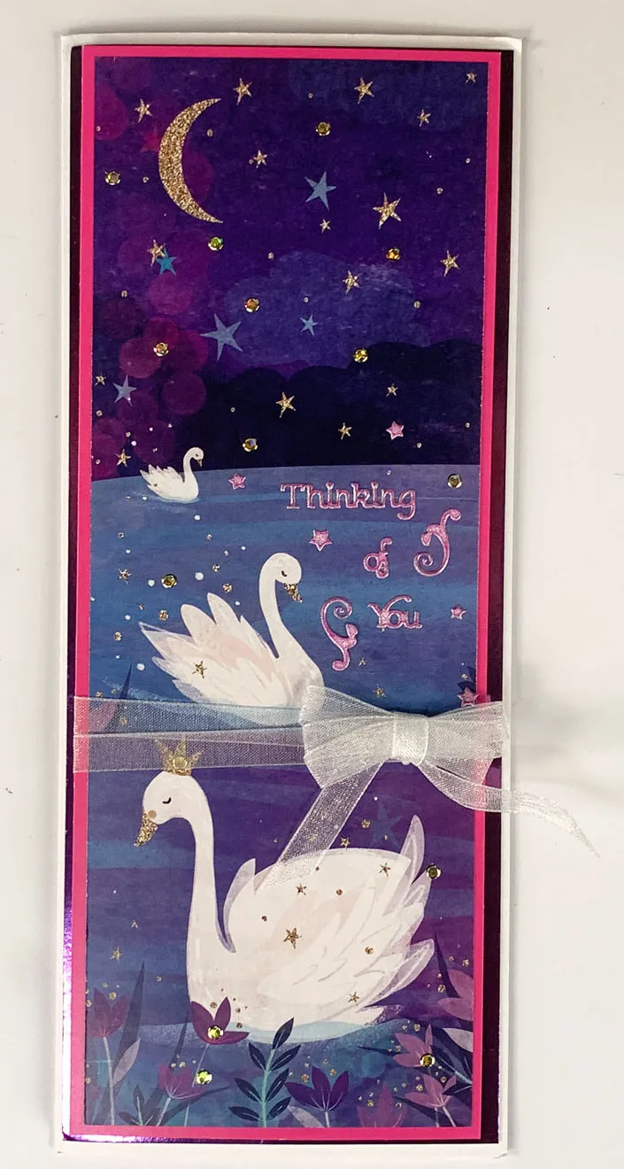 Select the page with three swans and cut the single swan to be 2 7/8” wide. Cut the left side (with 2 swans) to also be 2 7/8” wide then cut off just under the lower swan. Glue the two swans image above the single swan attaching it at the horizon line. The piece will be 2 7/8”x8”. Mat on pink Adorable Scoreable leaving 1/16" pink border. Wrap ribbon around where the pieces are joined at the horizon line. Mat on Purple Mirri cardstock with 1/8” borders. Glue to the card and Zot™️ a 1" wide bow as shown. Place gold Jewel Dazzles™️ and Tiny Words and Phrases Dazzles™️ as shown.