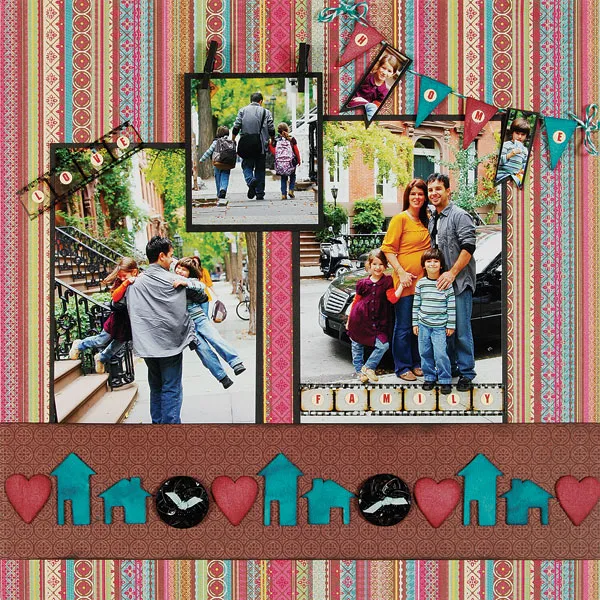 Place chipboard houses and hearts on scrap paper and color with the surface of the inkpads, Maroon for hearts and blue for houses. Let dry and glue in pattern shown across the brown border with 2 black buttons.