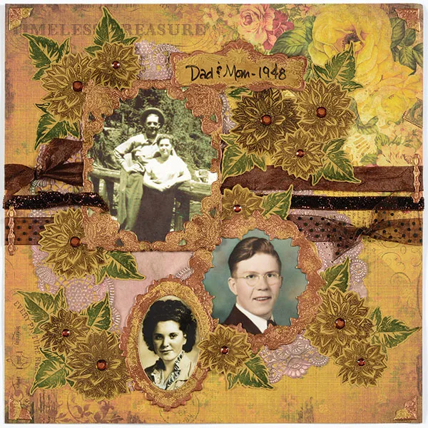 For the page: Place the Timeless Treasures corner design paper with the roses at the upper right. Place an oval and a round doily on the craft sheet, then rub the Kismet and Thunder ink pads over them, blending the inks where they overlap. Let dry, then glue the oval doily vertically near the left edge. Glue the round doily at the lower right, overlapping the first doily.