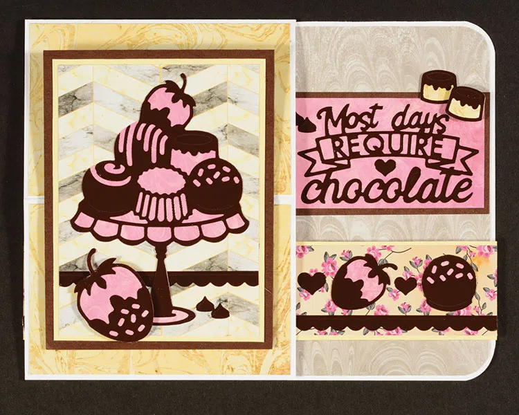 Place the plate of chocolates on Rooted In Love pink marble paper and cut along the edges. Glue it to the center of the zigzag paper, then mat the paper on ivory cardstock with 1/16" borders. Mat it again on brown cardstock with 1/8" borders. Foam tape just the lower half to the lower front panel.