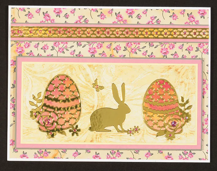 Cut 5½"x2½" Rooted In Love tan marble paper and place a bunny Dazzles™ in the center. Place two egg Dazzles™ on the inked cardstock and cut along the edges. Use double-sided tape to attach one egg on each side of the bunny. Decorate around the bunny and eggs with gold and jewel Dazzles™.