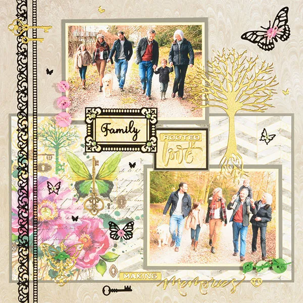 Place the 2 7/8"x1 7/8" frame Dazzles™ on Rooted In Love tan marble paper and cut along the edges. Place “family” in the center. Place “rooted in love” Dazzles™ on tan marble paper and trim it to 2"x1½". Mat it on black cardstock with 1/16" borders, then on gray cardstock with very narrow borders. Glue it and the frame overlapped in the page center as shown.
