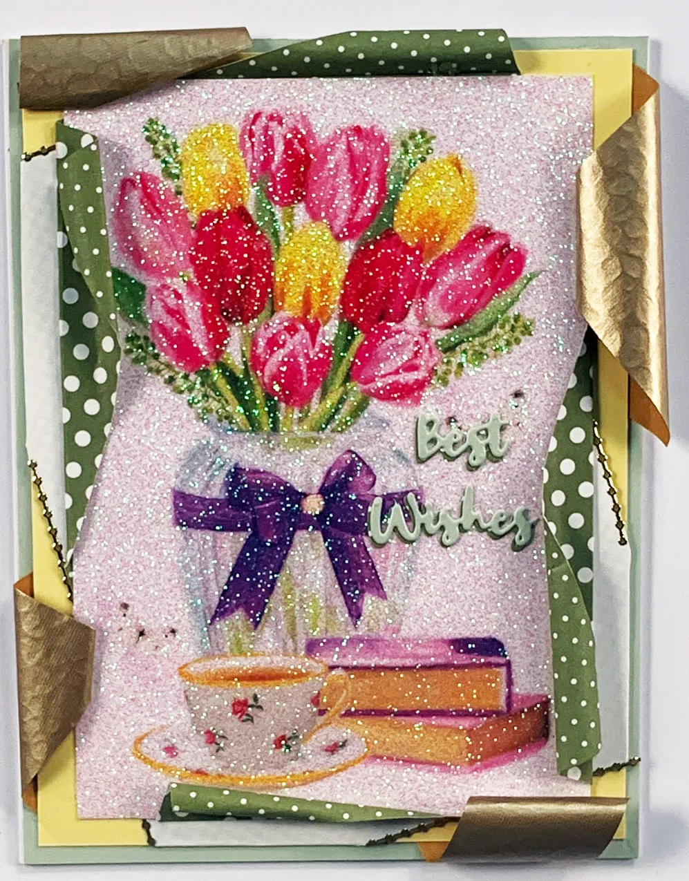 Cover the card with green Adorable Scorable. Cut 4 ¾”x6 ¼” yellow Adorable Scorable but do not glue down. Glue 4x6” from the background area on the tulip Insert paper and place at an angle on the yellow; trim to fit. Place gold Thin Line Dazzles™ around the edges. Cover the tulip image from the Little Book with a Clear Glitter sheet and trim to fit.