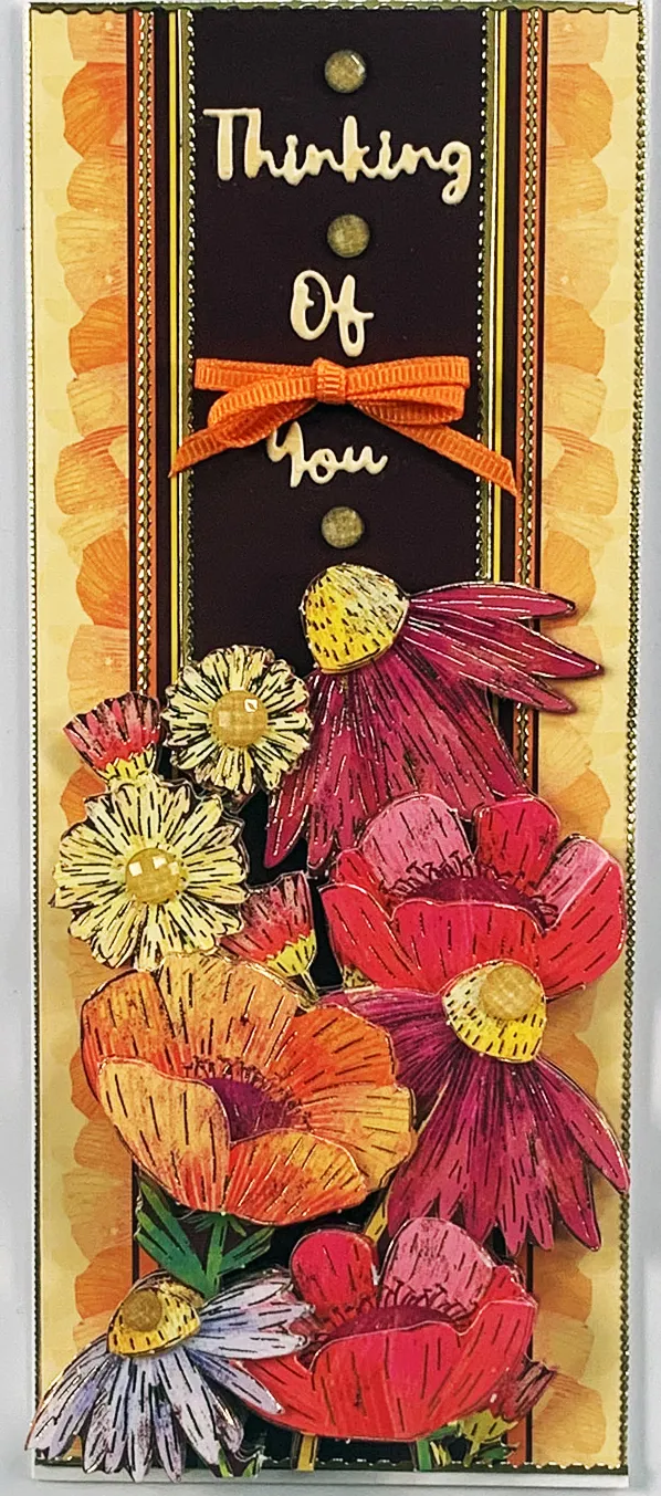 Cut 3.25”x8.25” Florals cardstock and glue to the card front. Place Thin Line Dazzles™ as shown. Use foam tape to attach the die cut foiled layers over the matching art. Die cut the Sentiment from dies out of the remaining cardstock. Glue as shown in center block. Zot™ on an orange bow and place Gemstones as shown.