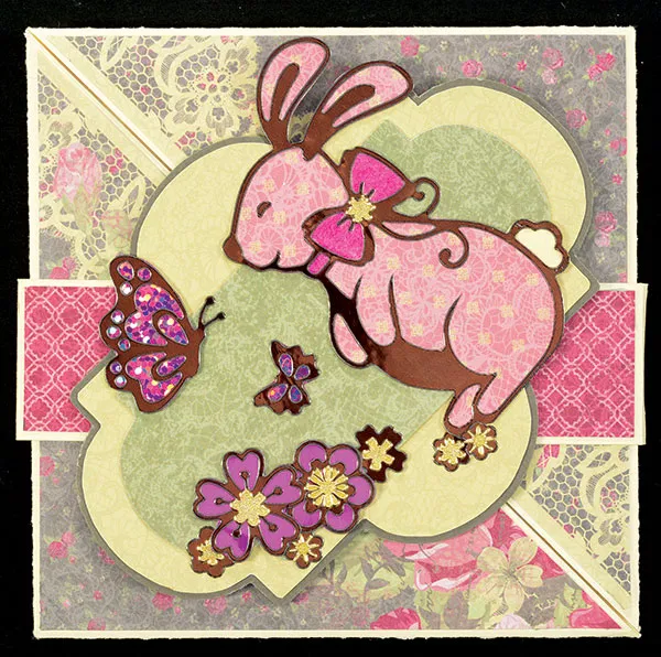 Place the Dazzles™ bunny shown on Roses & Lace pink/yellow paper and cut out. Use a pink pencil to color the bunny’s bow. Cut two Dazzles™ borders to fit across the bottom near the point on the inside center panel. Glue and place all the Dazzles™ as shown.