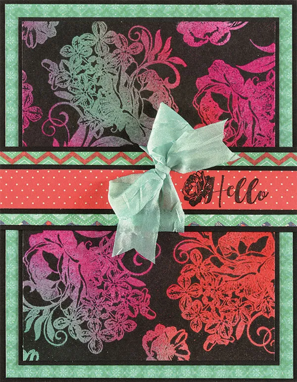 Cut 2 7/8"x5 5/8" white cardstock and repeat the Black Magic technique on it, using Cracked Pistachio and Picked Raspberry inks and the same stamps as for the front panel. When dry, mat the panel on black cardstock with 1/16" borders, then glue to the teal paper near the left edge, slipping it under the ribbon.