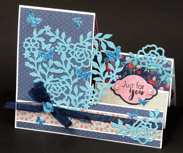 Die cut and emboss two open roses as for the heart. Glue one to the front at the right edge and the second on the back step, extending above the edge as shown.
