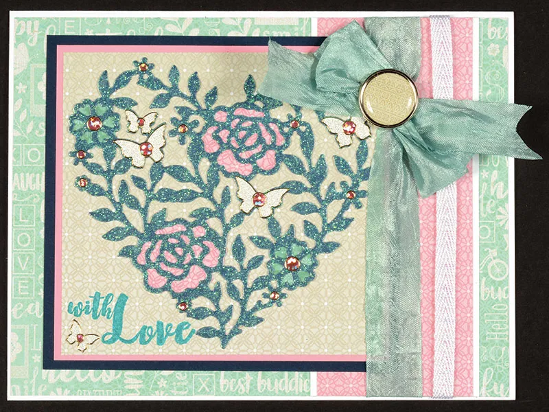 Glue the heart die-cut to Little Things tan paper, then trim it to 4 1/8"x3 7/8". Mat on pink cardstock with 1/16" borders, then on navy cardstock with 1/8" borders. Stamp “with love” in the lower left corner, then glue the panel to the front ½" from the left edge, slipping it under the green ribbon.