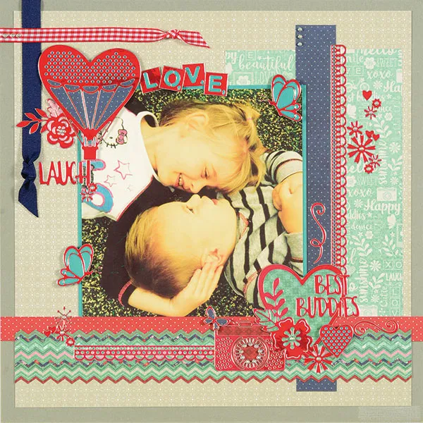 Mat the photo on teal cardstock with 1/8" borders, then glue it to the page, just overlapping the navy paper’s left edge. Cut 12"x¾" Little Things red pindot paper and glue across the page, overlapping the lower edge of the photo.