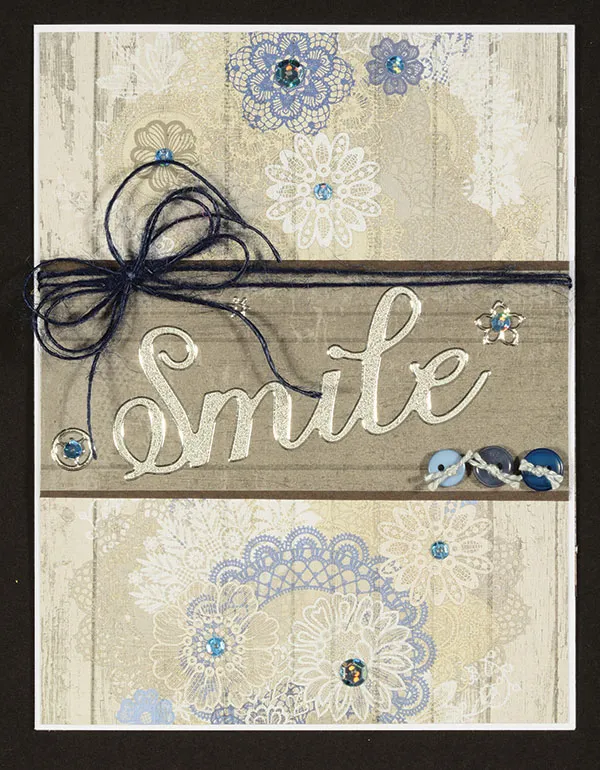 Wrap two 6" lengths of navy jute across the upper edge of the brown boards paper, and glue the ends to the back. Glue the constructed front centered on the card front. Place the “smile” Dazzles™ across the center of the boards paper.