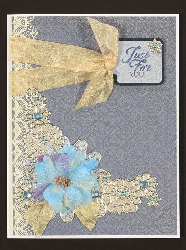 For the card front: Place the card with the fold on the left. Cut 4 7/8"x6 3/8" Indigo Lace dark blue doilies paper with the lace along the left edge. Die cut a 1¼"x1½" tag from Indigo Lace light blue doilies paper and mat on navy cardstock with 1/16" borders. Re-punch the hole, then turn the tag with the hole on the left and stamp “just for you” on it with Sailboat ink.
