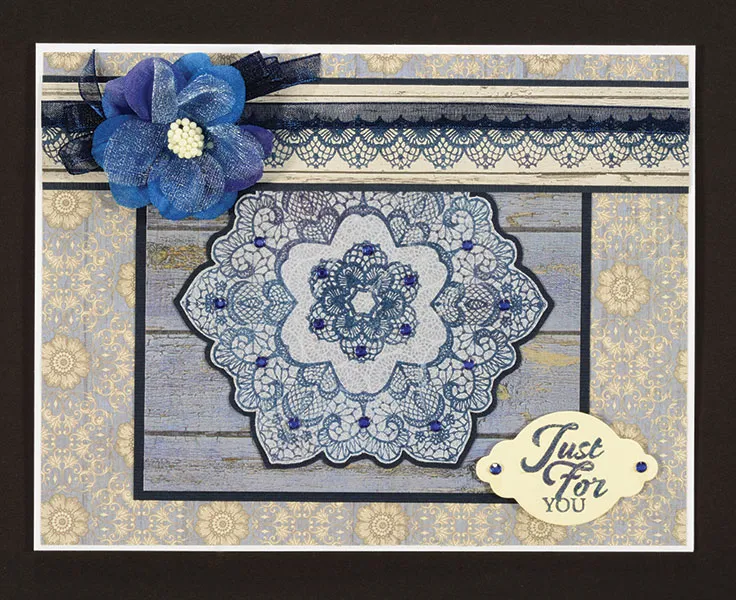 Make a 4-loop bow with the same ribbon and tie the center with thread. Use double-sided tape to attach it to the first ribbon, 1½" from the left edge, then attach a 1¾" bloom just under the center. Die cut a 1¾"x1 1/8" label from ivory cardstock, then stamp and emboss “just for you” on it using Sailboat ink. Foam tape the label at the lower right and place rhinestones on the front as shown.