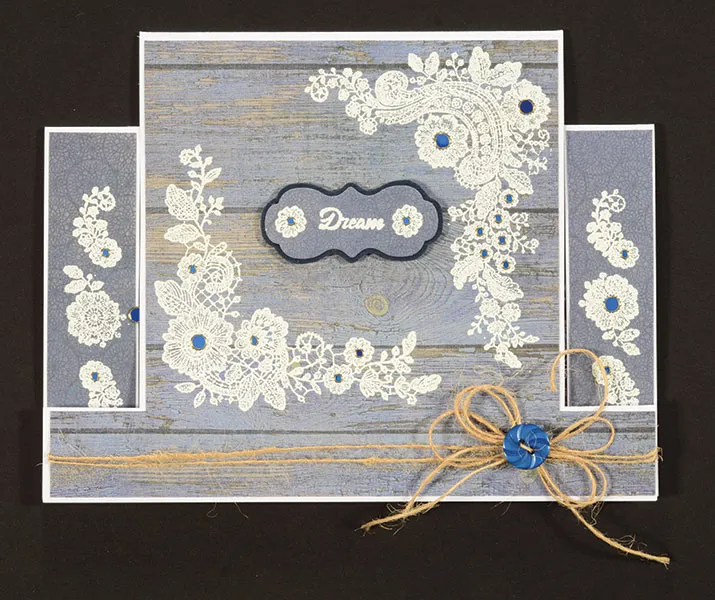 Wrap two 7" natural jute strands across the paper 3/8" from the bottom, and glue the ends to the back. Glue the paper centered on the card front. Cut two 7/8"x3 7/8" Indigo Lace dark blue doilies papers. Stamp and emboss the flowers on each as shown, then glue one paper centered on each side step.