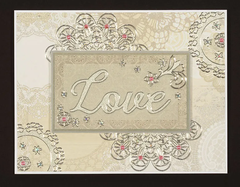 Cut 3½"x1¾" vellum and place the “love” Dazzles™ in the center. Cut 4"x2¼" Indigo Lace tan doilies paper and glue the vellum centered on it, placing adhesive just behind the letters. Mat the paper on cardstock, then on Silver paper, both with 1/16" borders. Place foam tape on the back.