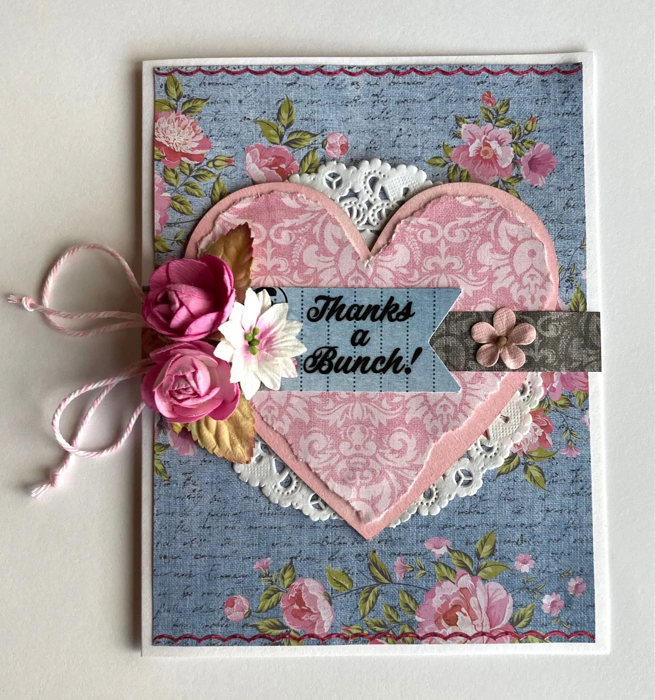 LeNae glued paper from Denim Bouquet Artful Card Kit to the 5”x6.5” card. She used Flamingo Paradise Prism ink on the Chipboard then glued pink Denim Bouquet torn paper on top. She glued 4” Paper Doily on the back and glued it to the card. A brown strip of Denim paper was glued across the heart and a die-cut on top. She added Blush Country Blooms and Ballet Slipper Pixie Petals flowers with Thin Line Glitter Dazzles™ stickers at the top and bottom. Baker’s twine from the Light Pink Ribbon Set finishes the card.