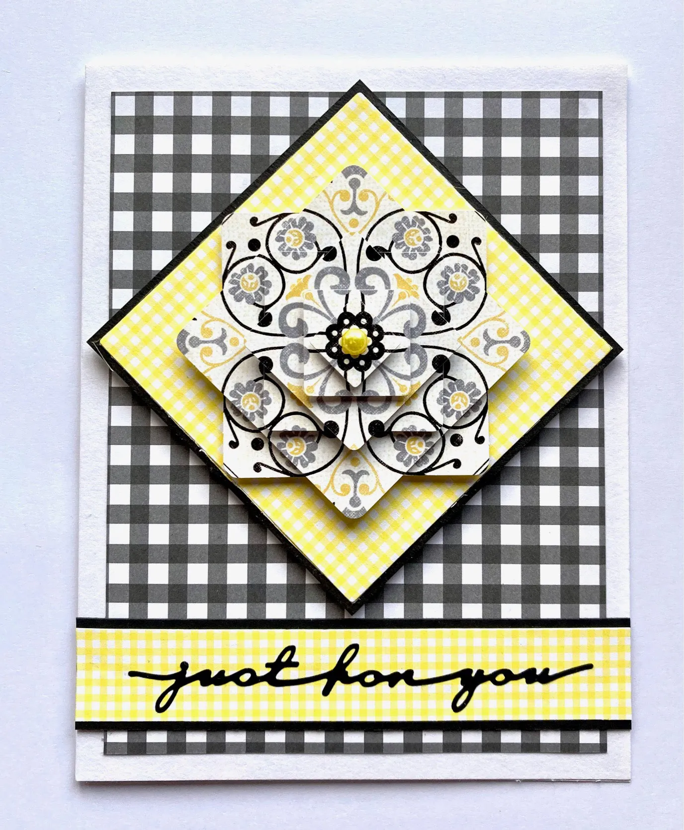 LeNae glued black 6”x6” Gingham #1 paper on her 5”x6.5” card. She covered the square chipboard with black Gingham #1 Cardstock then glued 6”x6” Gingham #1 yellow on top. She layered Sunny Medallions Pyramid Paper Tole using foam tape on top then foam taped it to her card. She matted 1”x5” yellow Gingham #1 to black Cardstock with 1/8” borders then glued it to her card. 500 Script Greetings Dazzles™ stickers are the card message and a Rainbow Flat Back Pearl in the center of the Paper Tole.