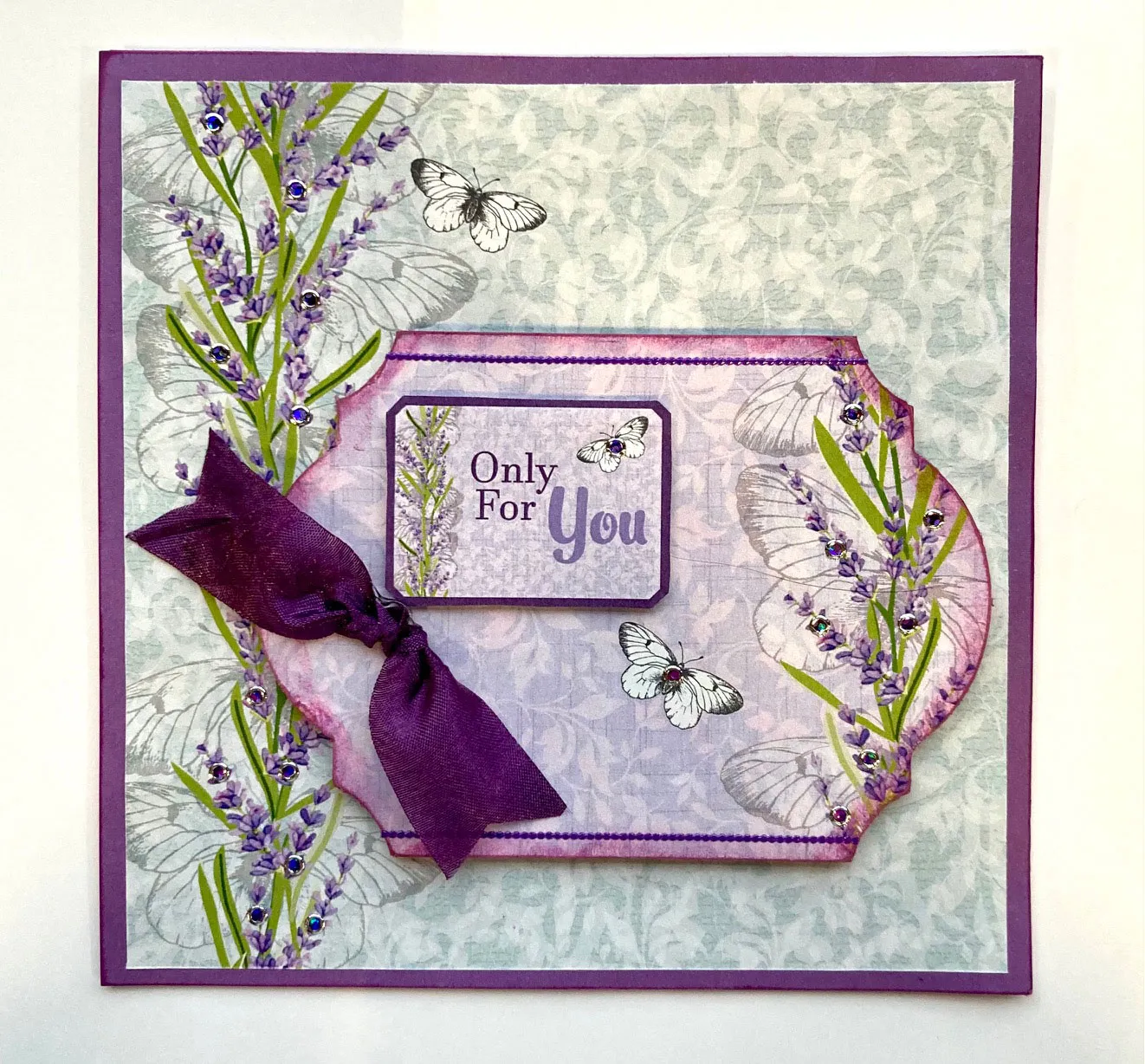 Debbie cut her card to 5”x5” and covered the front with Secret Garden Cardstock. She glued 4 ¾” square Secret Garden 6”x6” Paper on top. She also covered the Chipboard with the Secret Garden Paper and colored the edges with a Blackcurrant Jam ink pad. She foam taped it on top and added a Secret Garden cut-out. A Purple Ribbon Set bow was Zotted™ in place with Thin Line Colorful Dazzles™ and Purple Jewel Dazzles™ for accent.