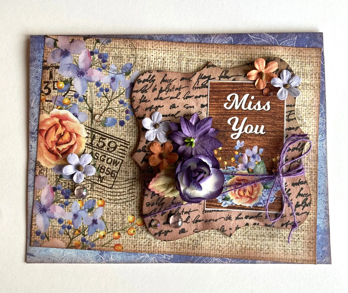 LeNae covered her 6.5”x5” card with Country Blooms Paper then inked another Country Paper with Friar Brown ink pad and glued it off center. She used a black ink pad with All Over Script Stamp on the Chipboard then inked the surface with Friar Brown then added a cut out from the Country Papers. She wrapped Jute Twine and foam taped it to the card. She added Violet Country Blooms, Twilight Pixie Petals and Jelly Fish Sparkletz as shown.