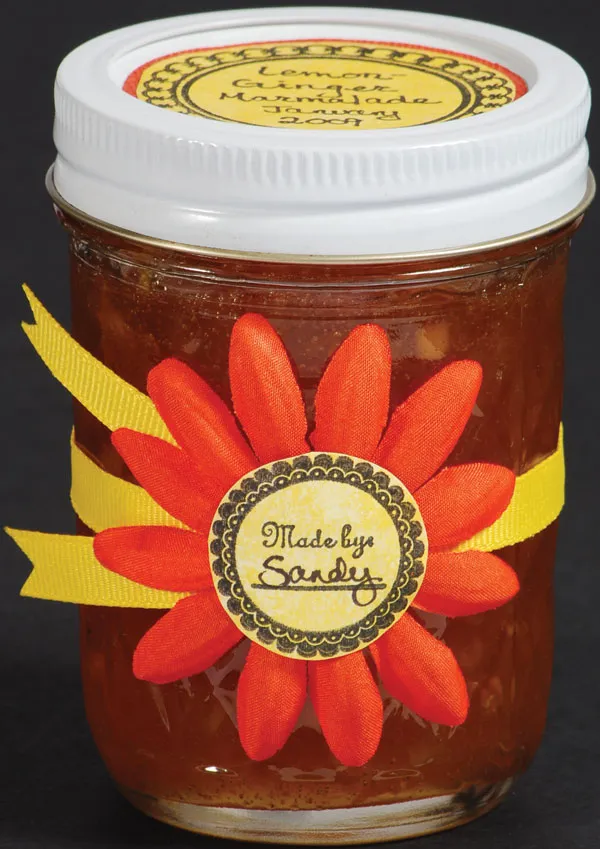 Using the scalloped circle border from Winter Swirls, stamp onto yellow paper. Cut out around the edges then mat on orange paper (obtain matting by using 2 1/8" circle punch cutting around to leave thin 1/16" border). Journal at the center. Attach to the top of the jar lid.
