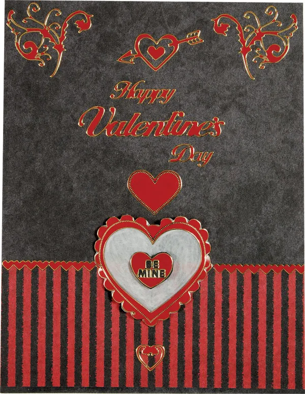 Place the card fold at the left side. Cover the card front with black paper. Cut a 2” x 5” strip of red/black striped paper and glue 1/8” from the bottom of the card front. Adhere heart border to the top edge of the striped paper.