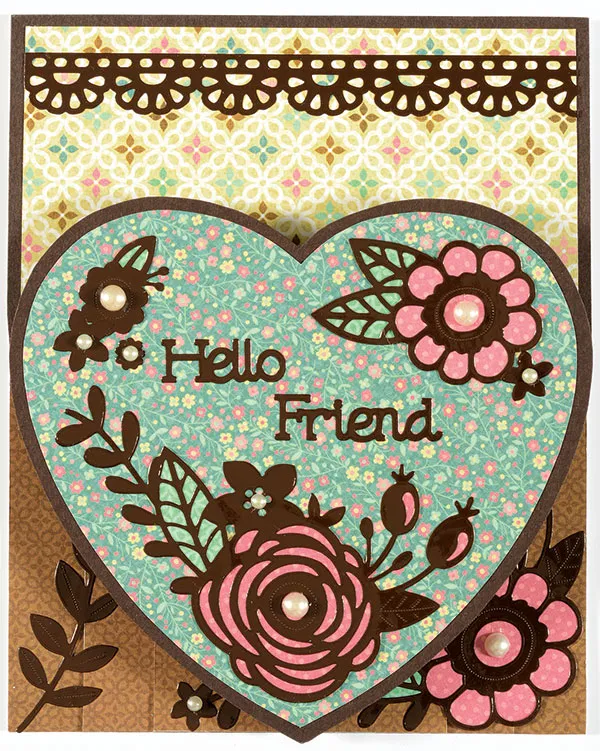 Back the 1¾"x1 1/8" flower Dazzles™ with the Emma’s Garden papers shown and glue to the heart at the upper right. Place “hello friend” across the center. Place the remaining Dazzles™ flowers and the pearls as shown, then set aside.