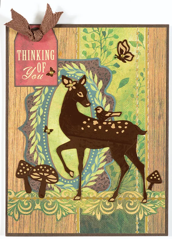 Cut a 4¾" section from the flourish border die cut and glue ½" from the bottom. Cut a 4¾" brass Dazzles™ border and place across the flourish border as shown. Cut out the “thinking of you” tag and glue to the card at the top left, then knot the twill, trim the ends, and glue to the tag top. Place the brown Dazzles™ shown on tan cardstock and cut out. Glue the Dazzles™ and place pearls as shown.