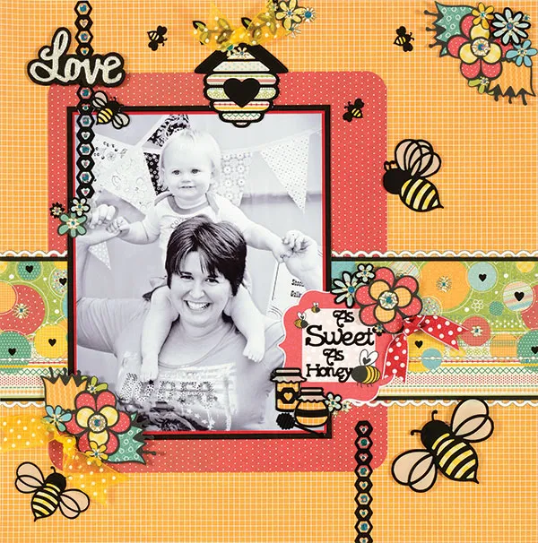 Punch out the Hopscotch die cuts shown and remove the nibs. Place “as sweet as honey” Dazzles™ on the label, then glue it overlapping the photo at the lower right. Place the wings of the three largest bee Dazzles™ on platinum vellum and their bodies on Hopscotch yellow paper. Cut around the edges, then glue and foam tape to the page as shown.