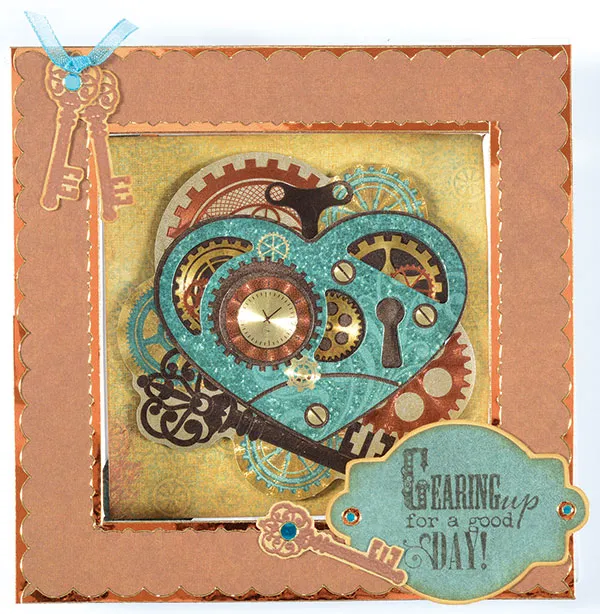 Trace and cut a Lola label from Steampunk teal paper and ink the edges Timber Brown. Stamp “gearing up…” in the center with Timber Brown, then mat on tan cardstock with 1/16" borders. Glue to the frame front at the lower right.