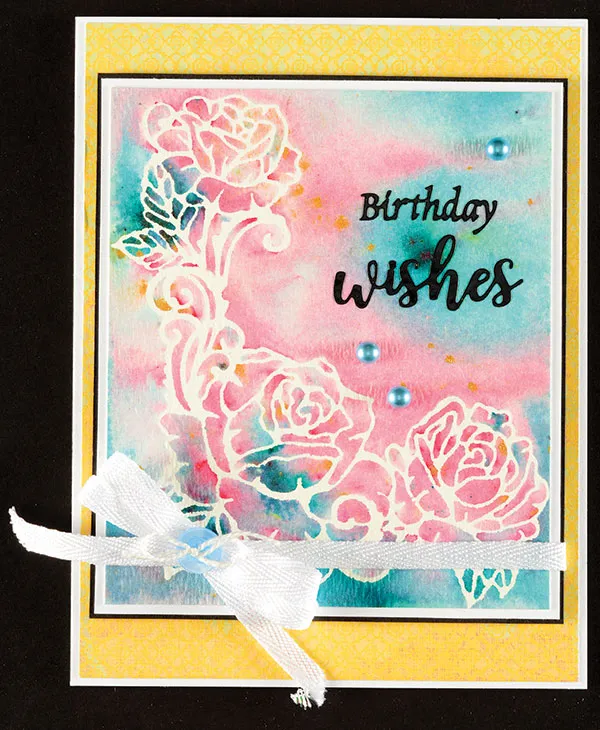 For the card front: Turn the card with the fold on the left. Cut 4 7/8"x6 3/8" Mirage yellow paper and glue centered on the front. Cut 4¼"x5" watercolor paper and place on the craft sheet. Place the largest rose Dazzles™ in the lower left corner. Place a 1¾" rose to the right of the first rose. Cut the stem off the stemmed rose, then place it climbing up the left side.