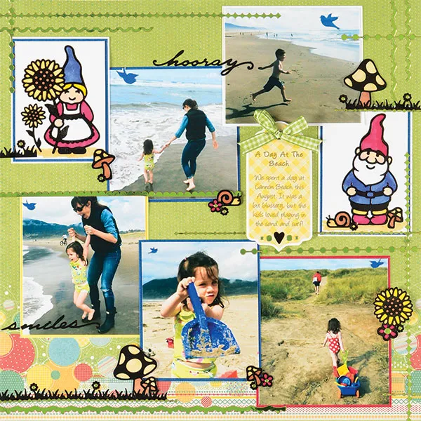 For the page: Remove the green border paper from the Hopscotch paper pack and place with the border at the bottom. Trim the photos so the action in each is highlighted, then mat each on a cardstock that accents the colors in the photo with 1/16" wide borders.