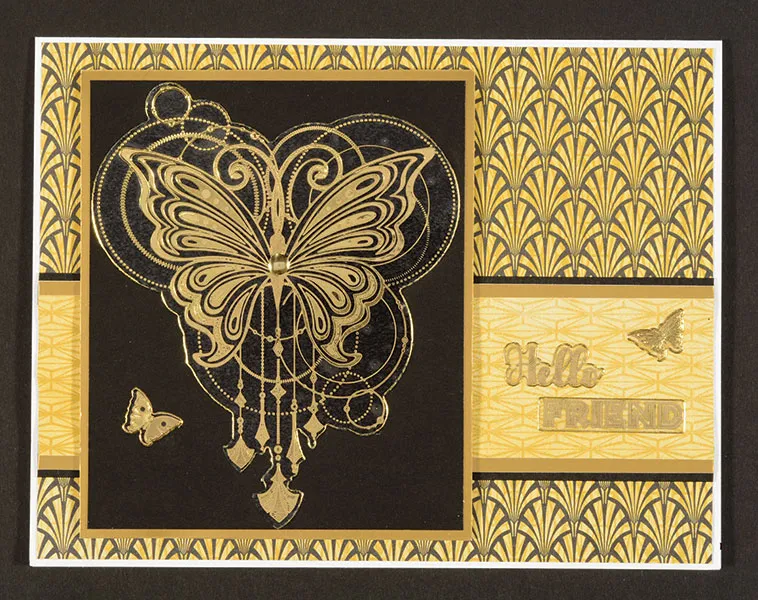 Place the large gold butterfly Dazzles™ on cardstock and trim it to 3½"x4¼". Mat it on Gold paper with 1/16" borders, then foam tape it to the front, ½" from the left edge.