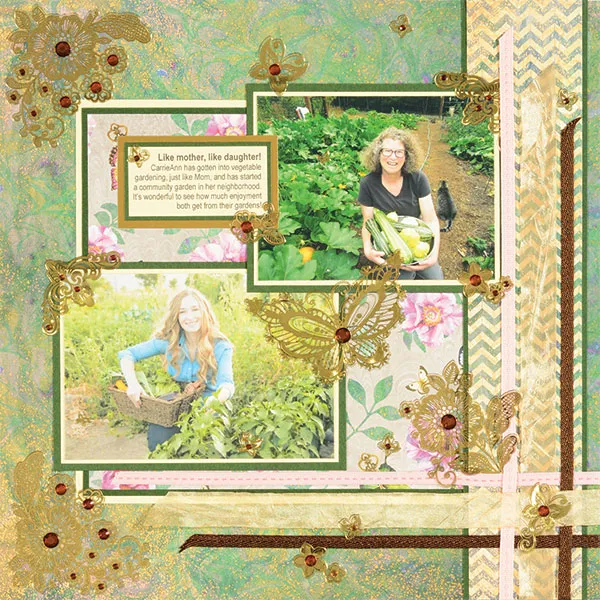Mat each photo on yellow cardstock with 1/16" borders, then on green cardstock with 1/8" borders. Glue both to the page as shown. Computer journal the action in the photos onto yellow cardstock then trim it to 2¾"x1 3/8". Mat it on green cardstock with 1/16" borders, then on Gold paper with 1/8" borders. Glue the journaling as shown.