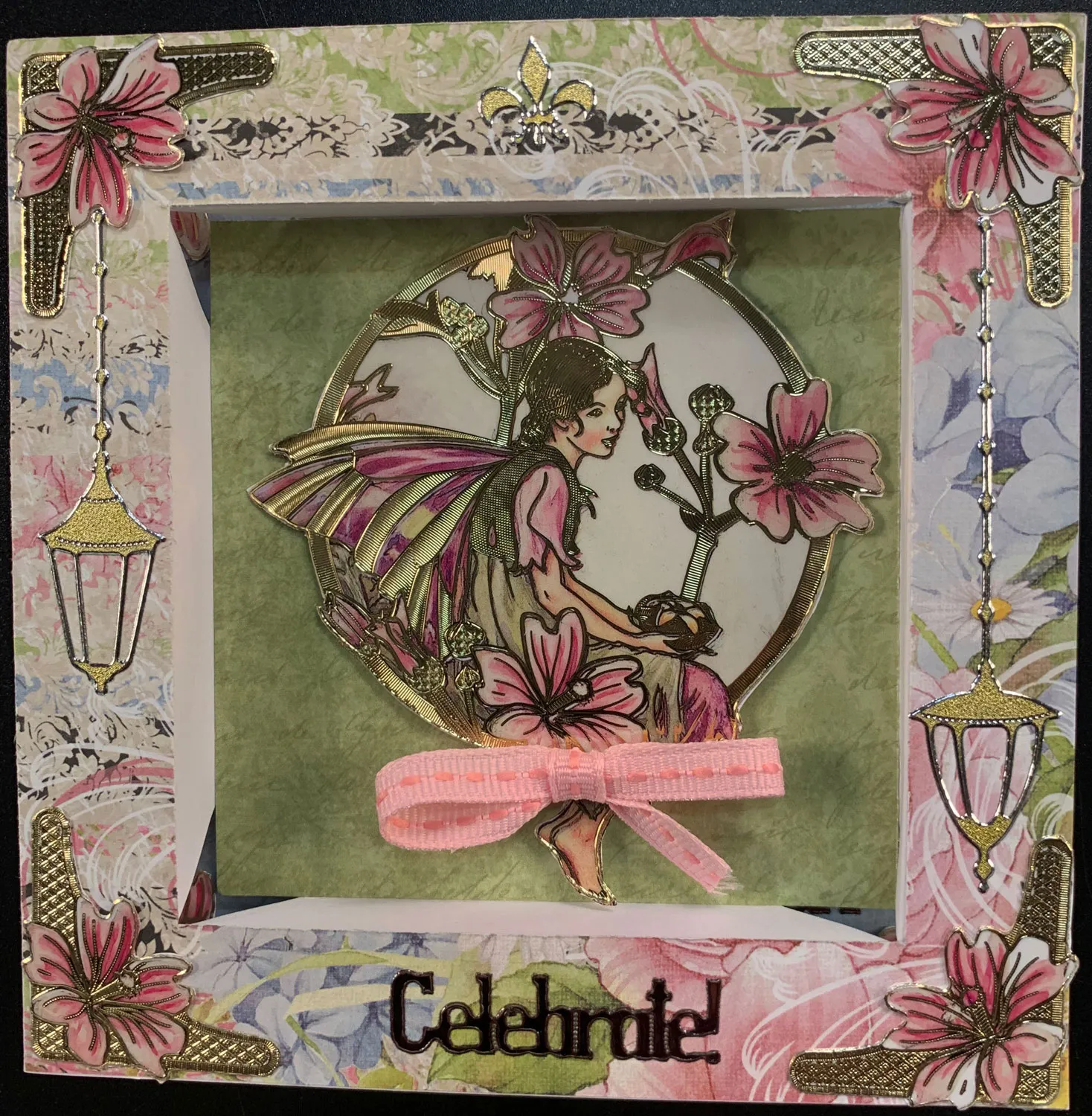 Assemble the 3-D Frame card as per instructions in the pack. Cover the frame with Romantique stripe paper. Glue Romantique green to cover the frame insert. Place the fairy sticker on top of its matching art and cut out. Glue to the center of the frame and place the fairy corners at the corners. Position Scrapbooking Dazzles™ to the frame and the greetings Dazzles™ at the bottom of frame. Zot™ a bow at the bottom of the fairy.