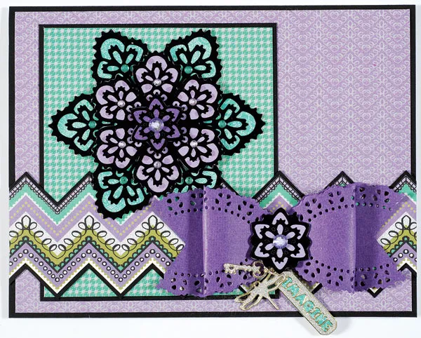 Place the “imagine” Dazzles™ charm on Simply Susan teal lace paper and cut around the edge. Place the charm back on it. Place the dragonfly charm front and back together, then repeat with the 5/8" key charm. Attach the charms to a jump ring, then attach it to a hole in the bow edge, close to the bow center. Place a 1" Dazzles™ flower on lavender cardstock, cut out, and foam tape to the bow center. Place rhinestones as shown.