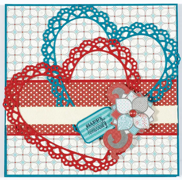 Die cut a 4¼" lacy heart from teal and red cardstocks. Glue the teal heart angled at the upper right, tucking it under the ribbon. Glue the red heart angled at the lower left. Use the template to trace and cut rounded tag C from Robin’s Red teal striped paper, then mat on teal cardstock with 1/32" borders. Stamp “happy anniversary” on it.