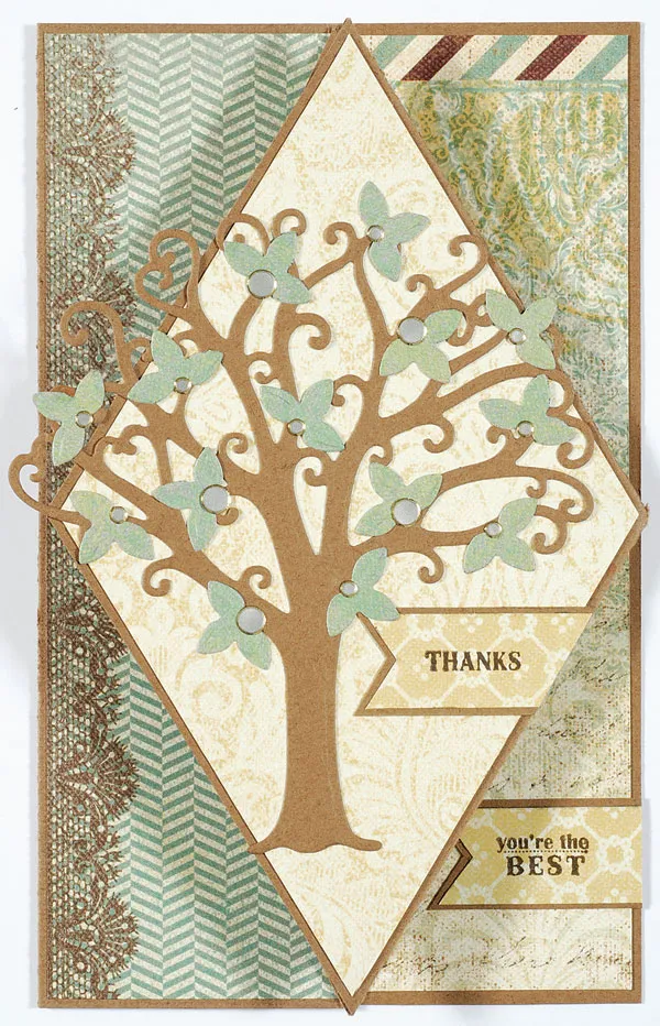 Die cut a tree from brown cardstock and glue to the front as shown. Die cut 14 leaves from Stolen Moments green textured paper and glue evenly spaced among the branches. Place jewel Dazzles™ on the leaves as shown. Cut the angled banner from Stolen Moments yellow tiles paper and stamp “thanks” on it. Mat on brown cardstock with 1/32" borders and glue as shown.