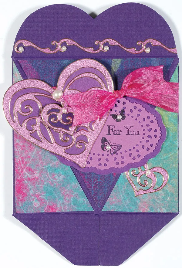 Wrap ribbon around the packet, 2½" from the bottom and knot the ends on the front, 1½" from the right edge. Place a 2 5/8" Dazzles™ heart on medium purple cardstock and a 1 1/8" heart on dark purple cardstock. Cut along the edges of both, then glue the large heart to the front as shown. Foam tape the small heart to the center of the large heart.