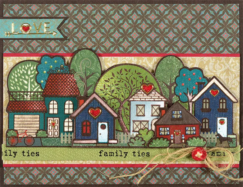 Trace and cut the banner pattern from Family Ties light blue diamonds paper and mat on brown cardstock with 1/16" borders. Place the Dazzles™ “love” near the right end, then glue the banner to the front at the upper left. Place the remaining Dazzles™ as shown.